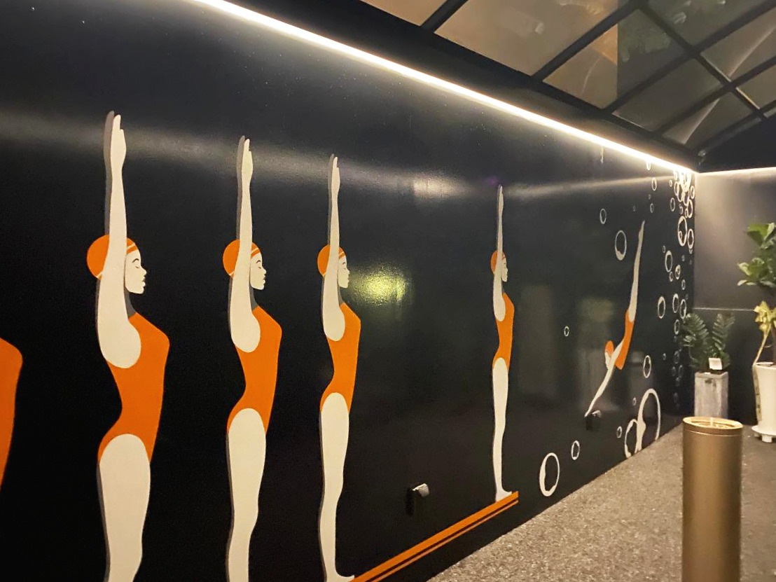 특히 탄산바의 그래픽 요소로 사용된 수영하는 여인의 이미지는 이곳이 2층인데도 불구하고 탄산수 바다에 들어온 듯한 착각을 들게 했습니다. 인테리어와 그래픽은 살구빛으로 메인벽면의 연두색과 보색이 되어 그 효과가 더 극적으로 다가왔습니다.