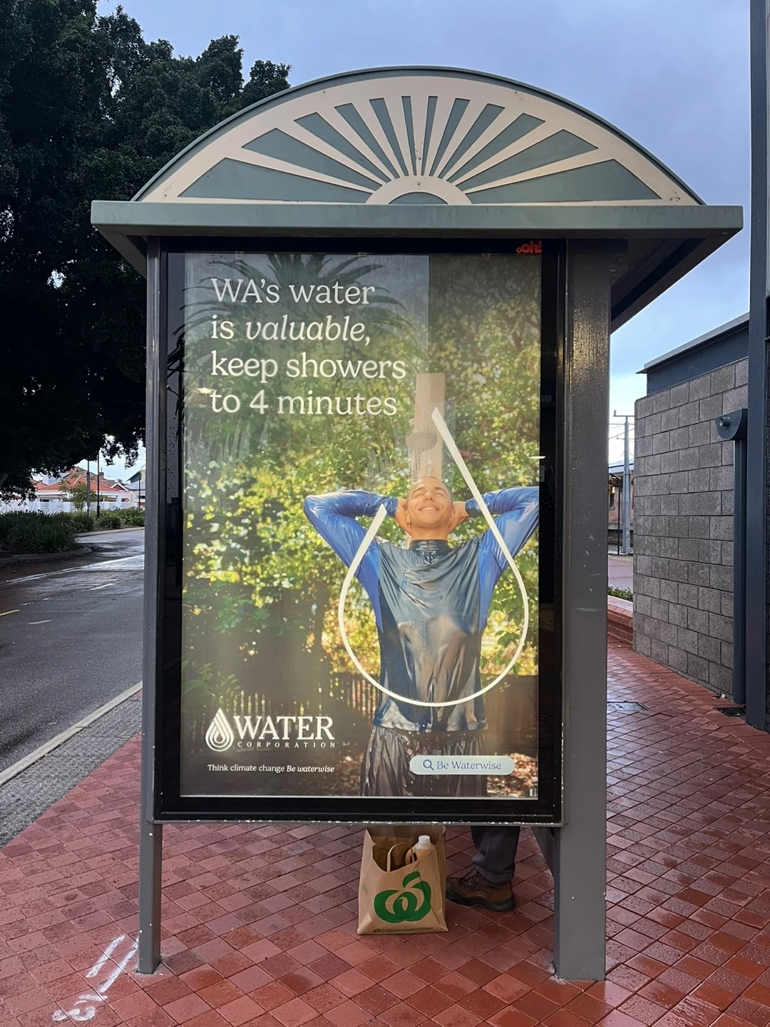 지난 8월 한 달 동안 트레인 앞 버스 정류장에 물 절약 공익 광고가 도배되었는데