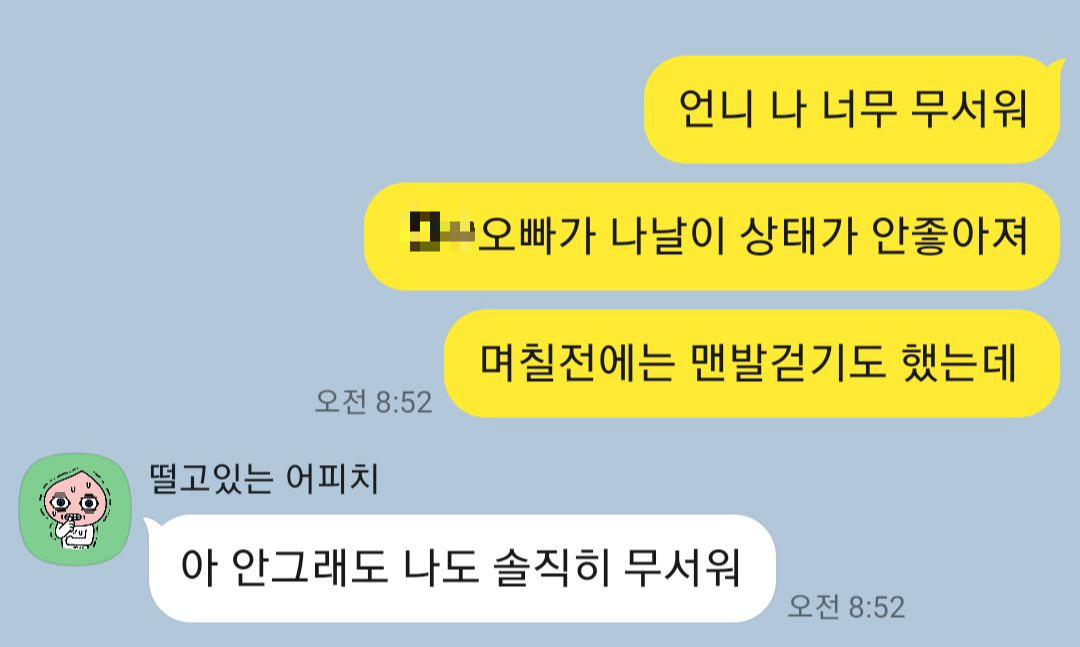 일어나지 못하고 근 이틀은 누워서 밥 먹는 것 말고 아무것도 못하던 남편을 보며 왈칵 눈물이 흘러나왔다. 제일 친하게 지내며 의지하던 언니에게 무작정 무섭다고 말을 걸었다.눈물이 앞을 가려 보이지도 않는 카톡창을 부여잡고 설명을 적어나가기 시작했다.