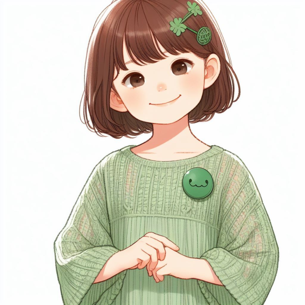 빙 이미지 크리에이터로 생성한 아들의 여자친구 가상 이미지 (명령어 : 초록색 핀을 꽂고 연두색 니트옷을 입고 웃고 있는 단발머리의 초등학생 여자아이 그려줘)