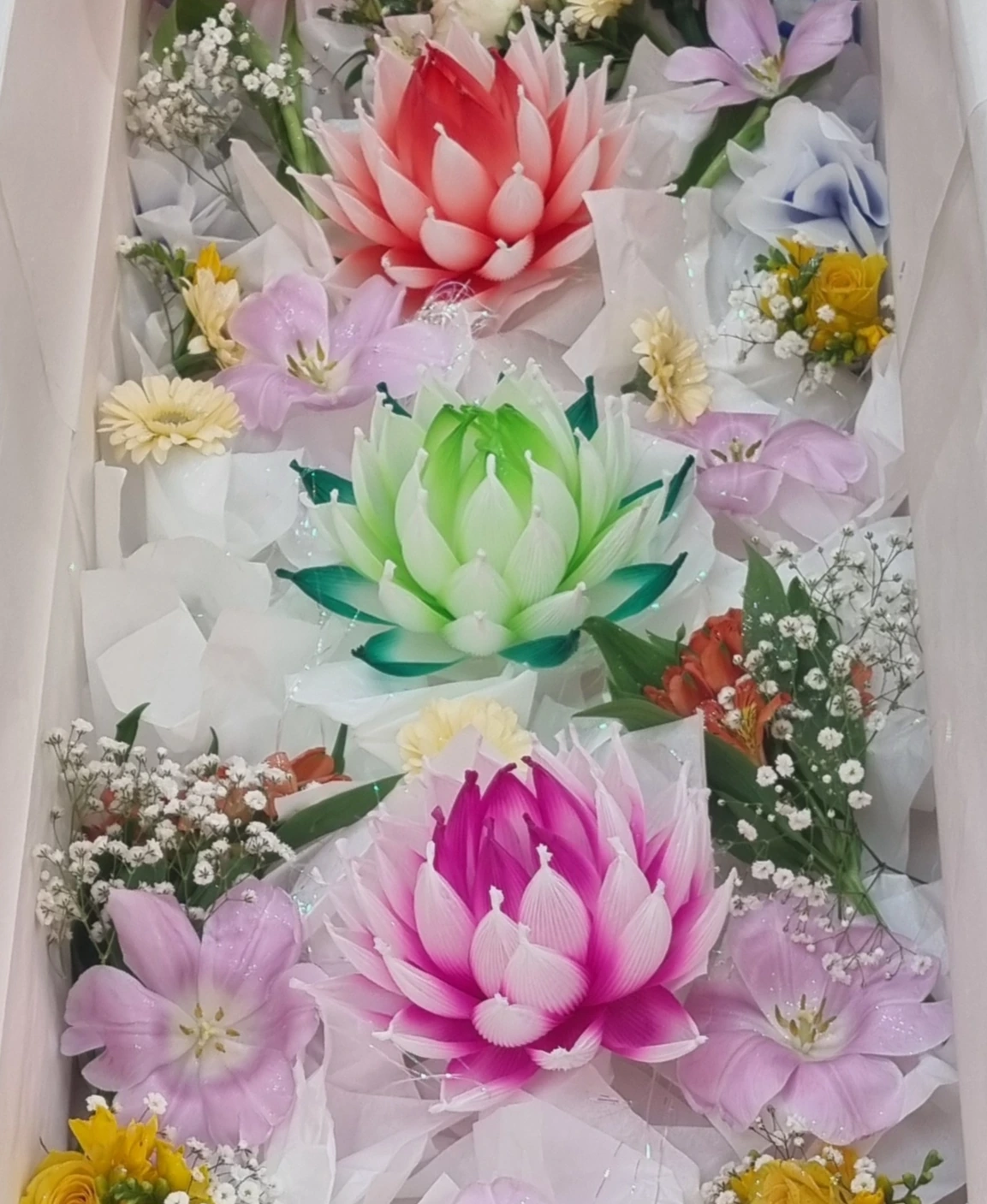 장례팀장님께서는 연꽃으로 만들어진 꽃모양을 손수 만들어 그 안에 적고 싶은 메시지를 쓰라 했다. 정화의 의미가 있는 연꽃을 같이 태움으로써 젊은 나이에 병사를 한 고인이 하늘에 가선 아프지 말고 잘 지내라는 의미를 담는다고 말하셨다.
