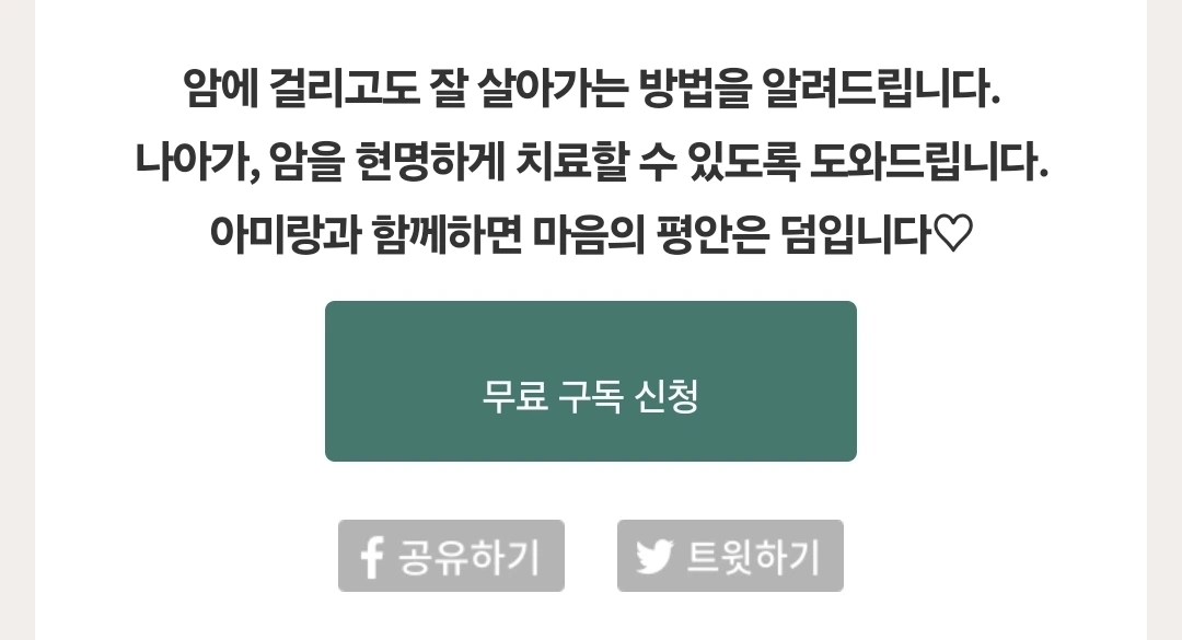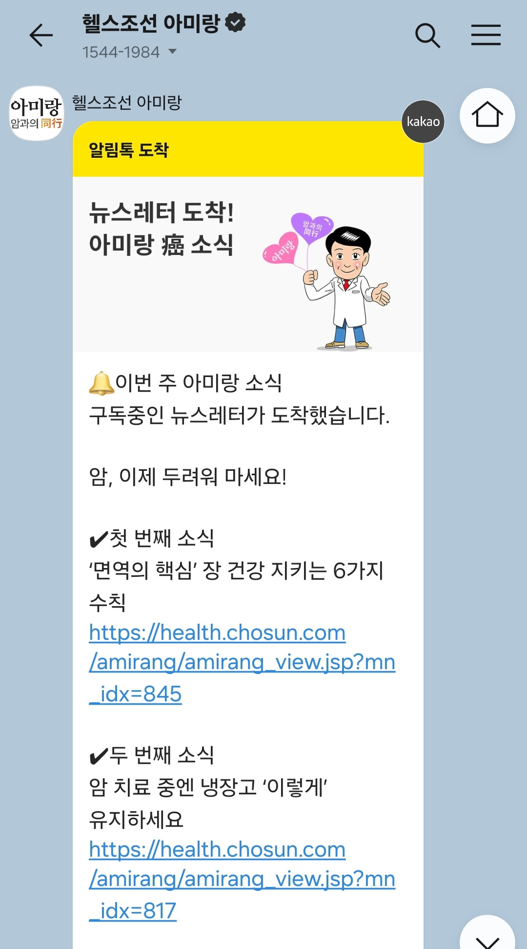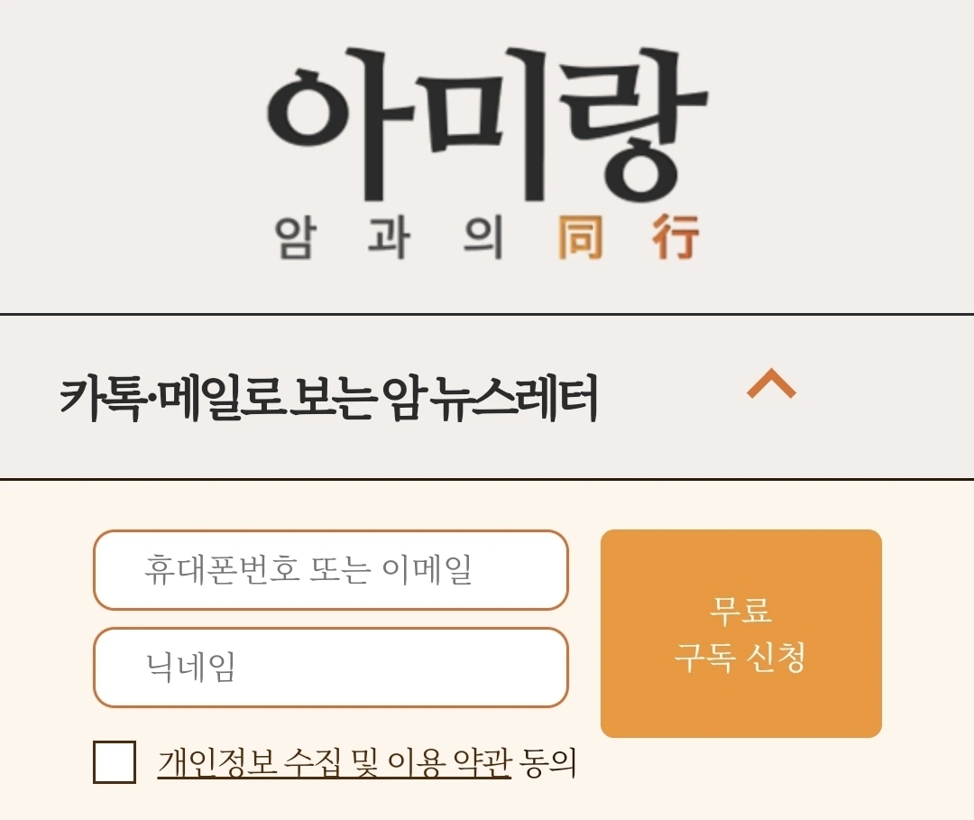 헬스조선의 '아미랑'은 암환자나 보호자의 지친 심리상태를 위로하는 '힐링', 암에 좋은 습관이나 음식 혹은 면역력 대한 신빙성 있는 정보를 전해주는 '암레터', 각종 암에 관련된 뉴스와 궁금증에 관한 사실을 논문과 정확한 근거를 통해 정리하여 알려주는 '뉴스' 섹션으로 나뉘어 정리된 암 전문 소식지(무료구독)입니다.