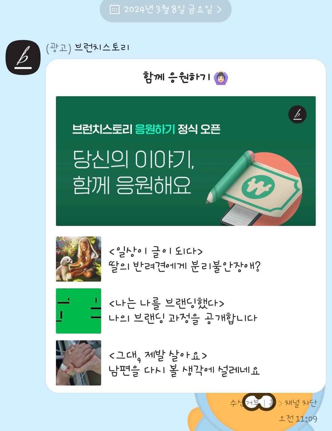 남편이 퇴원한 지 3일 사이에 발작을 일으켜 구급차로 이송되며 겪었던 일을 적은 '내일, 남편을 다시 볼 생각에 설레네요' 글이 브런치 상단에 올라가 응원하기가 쏟아졌다. 당시 브런치 말고 어디에서 유입되는지 경로를 알기가 어려웠는데 병문안을 왔던 친정오빠와 새언니의 말이 카카오톡 브런치스토리 채널을 등록하면 오는 카톡광고에 내 이야기가 소개되었다고 했다. 신기해서 카톡을 캡처해서 보내달라고 요청했다.