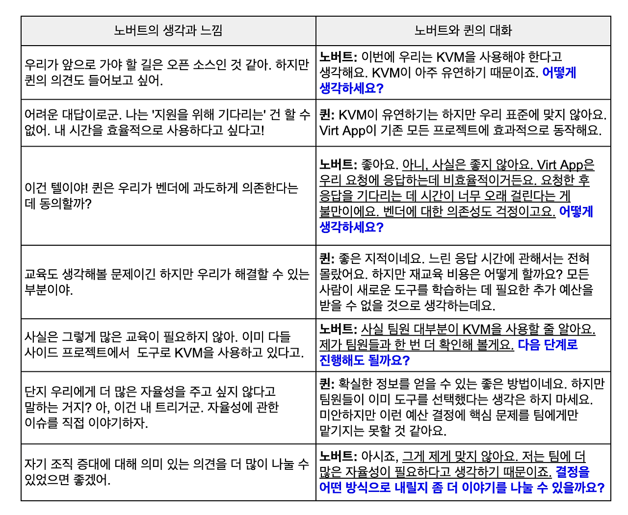 반대로 '순수하지 않은 질문'은 새로운 것을 배울 때보다 주장할 때 주로 사용합니다. 또한 어떤 의도를 숨기고 있거나 특정 반응을 유도하고자 합니다. 저자는 자신이 한 대화 내용을 돌이켜보면서 '내가 한 질문은 순수한가?'를 되짚어 보라고 합니다. 이때, 질문의 표현 자체만으로는 순수한 질문과 순수하지 않은 질문을 구분할 수 없으며, 둘을 구분하려면 겉으로 드러나지 않는 질문자의 생각을 들여다봐야 합니다. 다음은 순수한 질문과 순수하지 않은 질문을 비교할 수 있는 대화 예문입니다. <애자일 컨버세이션>에 있는 내용을 가지고 왔습니다.