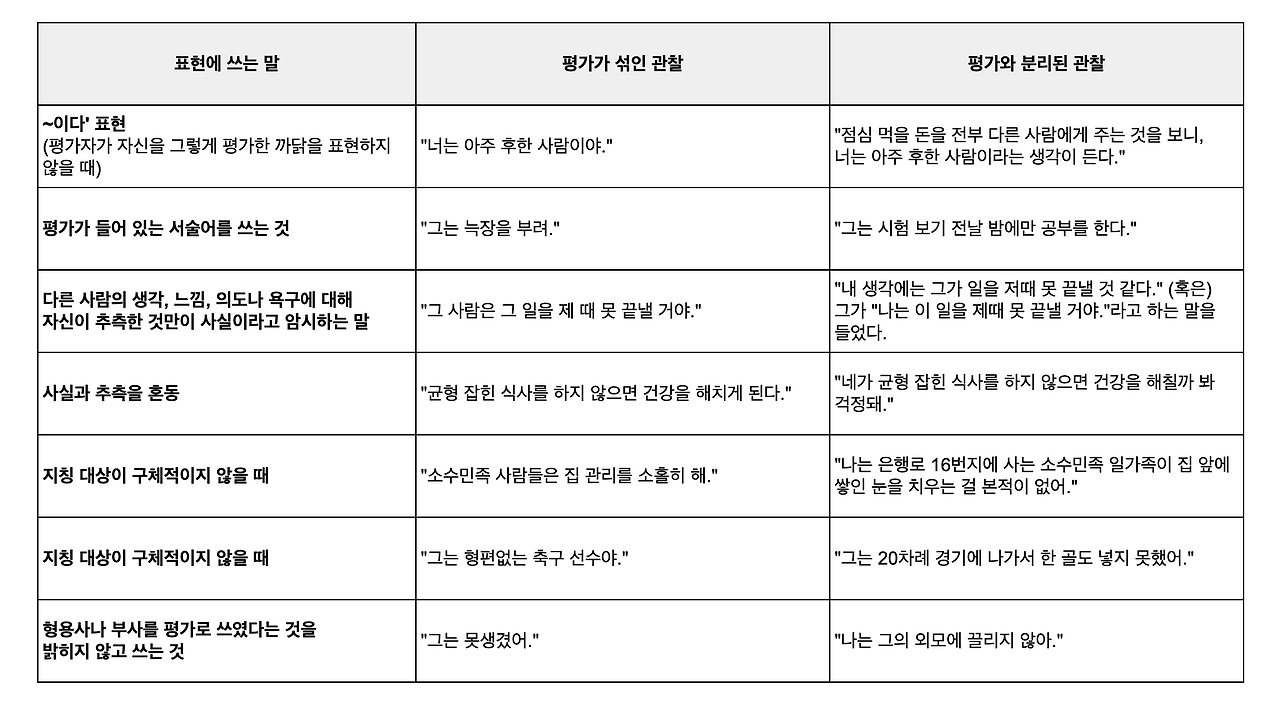 로젠버그 박사가 말하기를 '관찰'은 다른 사람에게 자신을 분명하고 솔직하게 표현하려 할 때 아주 중요한 요소이며, 이를 평가와 섞어서 전달하면 듣는 상대방이 내 말을 이해할 가능성이 줄어듭니다. 오히려 우리가 전달한 말을 비판으로 받아들이 쉬우며, 저항감을 품을 수 있다고 합니다. 아주 단적인 예로 "그는 시간 개념이 없다"가 아니라 "그는 지난 세 번의 약속에서 모두 30분이 지난 후에 왔다."라고 말하는 것이 평가와 분리된 관찰이라고 할 수 있습니다. 이외 평가가 섞인 관찰과 평가와 분리된 관찰의 예는 다음과 같습니다.