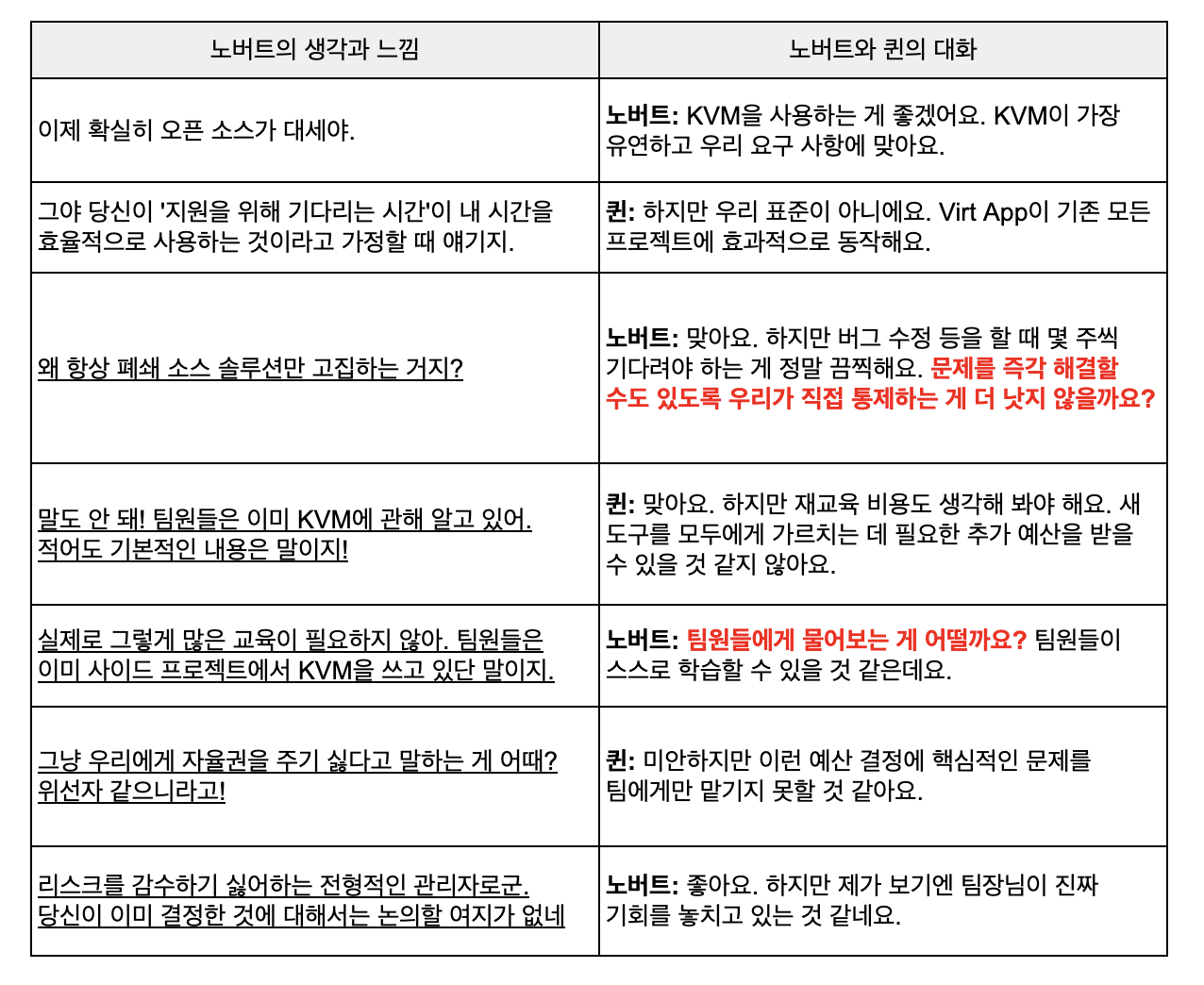 지금 이 대화 예문 사이에는 '순수한 질문' 외에도 다른 많은 대화 스킬들이 들어가 있습니다만, 우선은 노버트가 한 '질문'에만 집중해서 살펴보시길 바랍니다. 표에서 알 수 있다시피 오른쪽이 둘 간의 대화이고, 왼쪽은 노버트의 생각과 느낌입니다. 원래의 대화 예문과 수정된 대화 예문을 살피면서 노버트가 질문에서 자신의 의도나 욕구를 숨겼는지 혹은 드러냈는지를 잘 비교해 보시길 바랍니다.