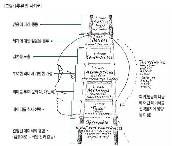 이는 행동과학자 크리스 아지리스는 그가 창안한 '추론의 사다리'를 살펴보면 더 정확히 알 수 있습니다. 추론의 사다리는 우리가 정보나 경험을 습득하는 것으로부터 행동에 이르기까지의 과정을 모형화한 것입니다.