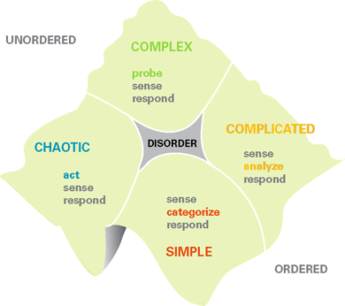 따라 효과적인 대응 방법을 찾을 수도 있습니다. 그렇게 되면 혼돈의 영역이었던 문제가 복잡한 영역 또는 단순한 영역으로 이동할 수 있습니다. 그리고 당연히 이 반대도 가능합니다.