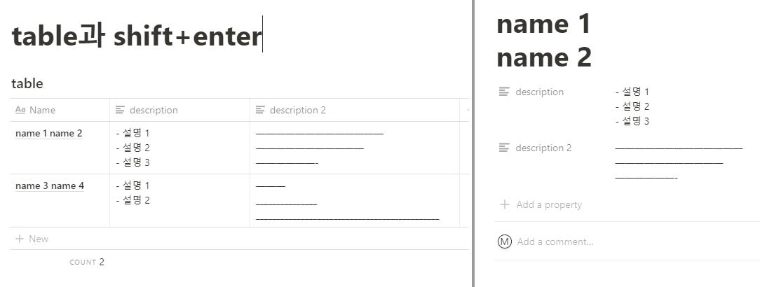 table 안에서 여러 정보들을 입력해서 사용하다보면 table 한 칸 안에서 또 여러 항목으로 나눌 필요가 생기기도 한다. 그럴 때 일반적으로 많이 쓰는 줄바꿈(shift+enter)을 적용하게 되는데, 이때 name property에서는 그러한 줄바꿈이 불가능하고 일반적인 text property에서만 가능하다.