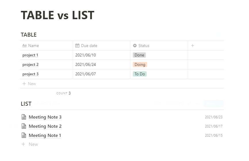 아마 대부분이 자연스럽게 table은 property 위주의 정보를 확인하는데, list는 회의록과 같은 긴 글을 기록하고 공유하는데 사용하고 있을 것이다. 하지만 이런 원론적인 차이를 알고 있으면 툴을 좀 더 용도에 맞게 사용할 수 있다.