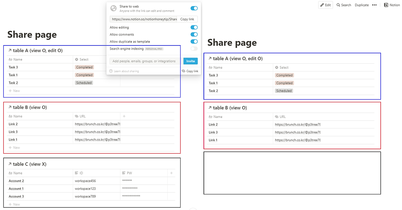 그 다음 외부인과 공유할 Share page를 만든 후 각각 table A, B, C를 copy link로 가져온 뒤, Share page 전체에 대해서는 share to web - allow editing으로 설정해주었다. 그다음 크롬에서 시크릿 창을 열어서 외부인이 해당 링크를 접속했을 경우 어떻게 보여지는지 확인해 보았다.