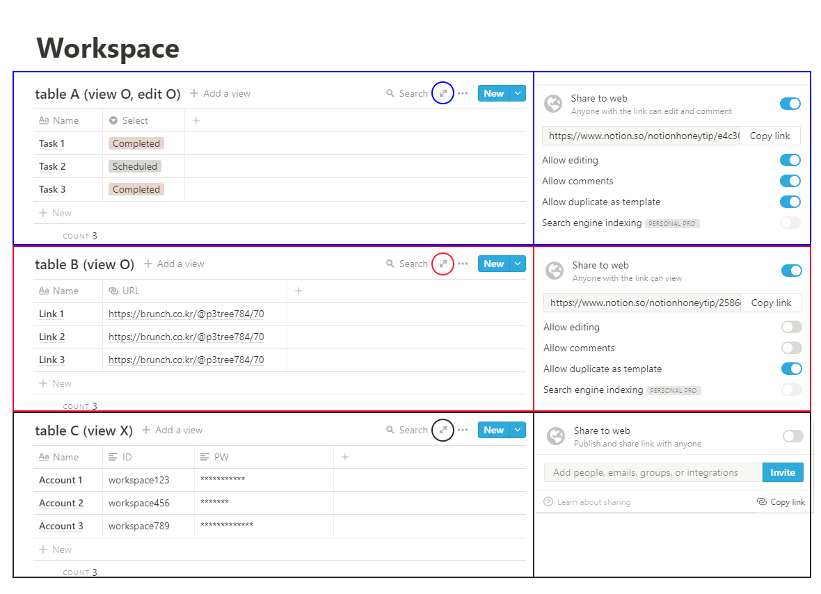 이처럼 inline으로 만들어진 database도 하나의 페이지로 각자 존재하기 때문에 이를 잘 활용하면 다양한 공유 설정을 할 수 있다. 아래 이미지를 보게 되면, 먼저 기존 workspace 페이지에서 3개의 table (database)를 만들어서 Open as page로 들어간 다음, 각각의 share to web 옵션을 edit 가능, view만 가능, share 불가능으로 나누어 적용했다.