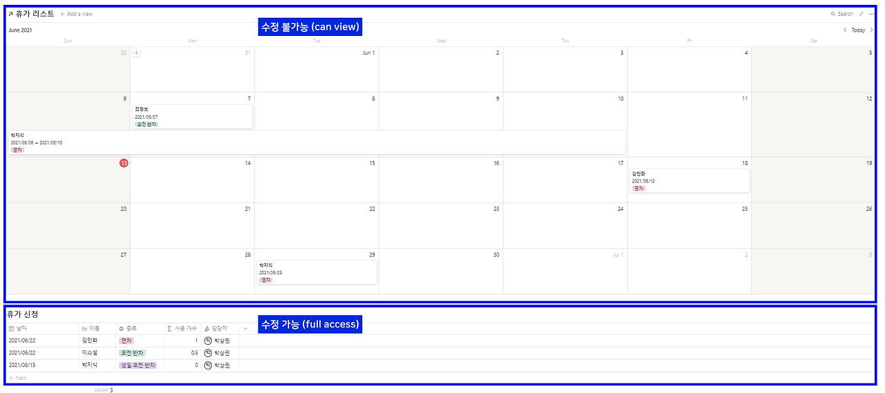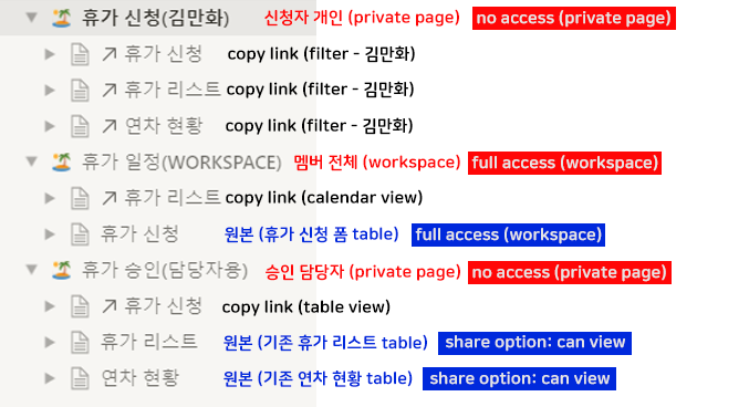 → 단, 다른 페이지에서 확인은 가능하게 해야 하므로 휴가 리스트와 연차 현황의 share to web을 on시켜줘야 함