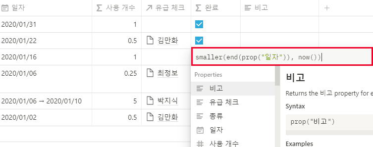 ③ 사용 개수 / dateBetween(end(prop("날짜")), start(prop("날짜")), "days") + 1