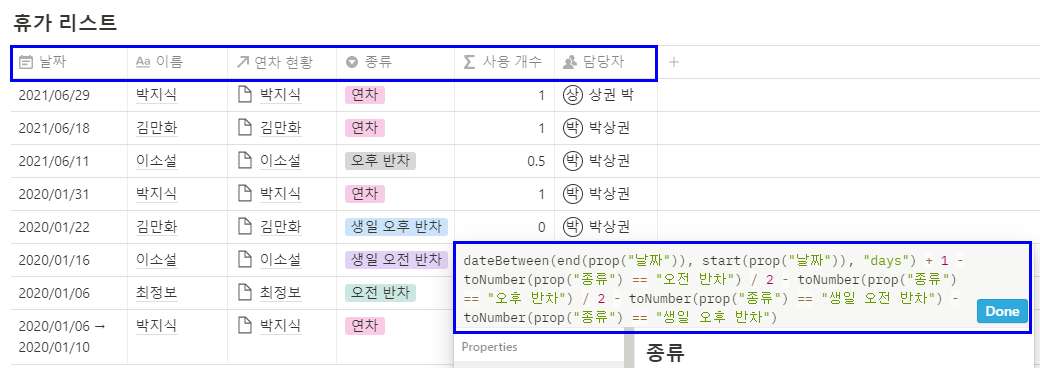 ④ 사용 개수 / - toNumber(prop("종류") == "오전 반차") / 2