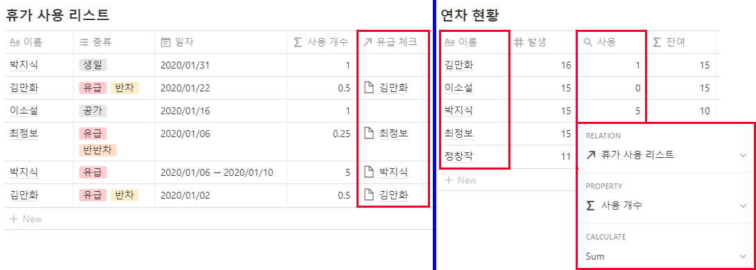 → 유급 체크(Relation): 총 사용한 연차 개수를 계산하기 위해 휴가 사용 리스트와 연차 현황을 연결