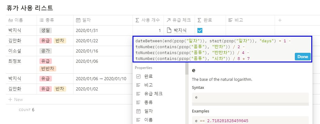 ② 사용개수 / - toNumber(contains(prop("종류"), "반차")) / 2
