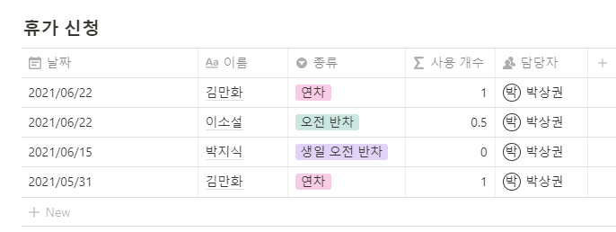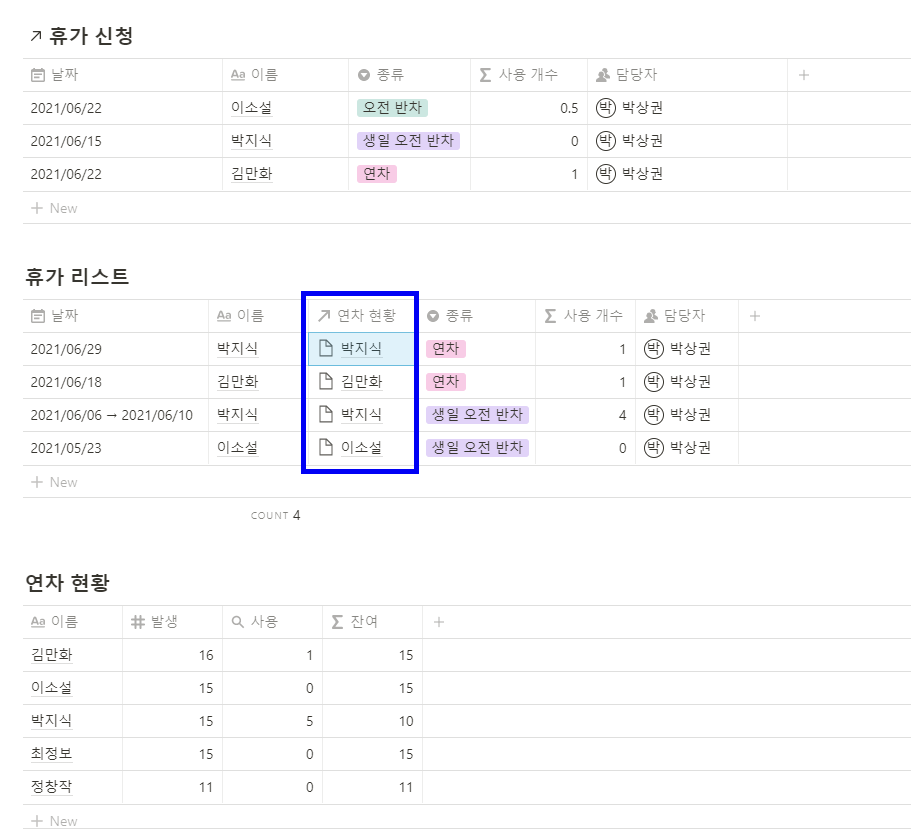 최근에 이전 직장 동료가 연락이 왔다. 하는 말이 회사에서 쓸 연차대장이 필요한데, 노션으로 구현을 해보려고 한다는 것이었다. 여차저차 얘기를 하다고 흥미가 생겨 내가 만들어주겠다고 했다.
