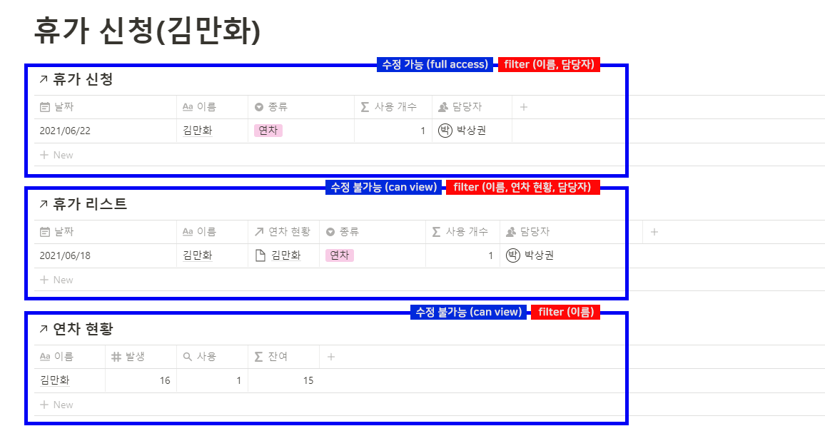 → 김만화 개인은 가장 상단의 휴가 신청 table 외에 휴가 리스트 table, 연차 현황 table은 수정할 수 없음