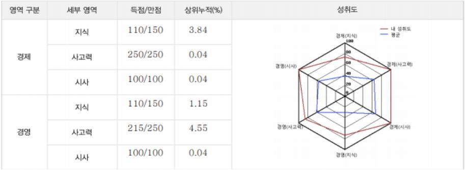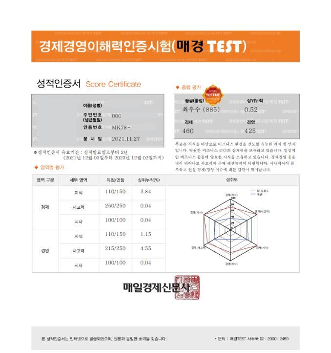 경제 500점, 경영 500점 기준 / 총 885점 득점(최우수)
