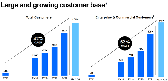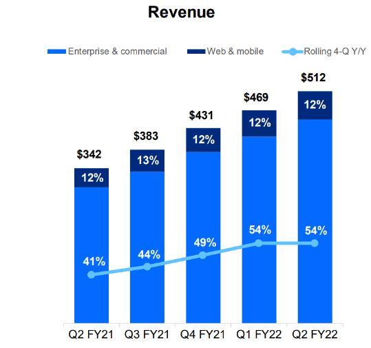 도큐사인의 사업 모델은 구독형 모델로 크게 전자서명, 부동산 플랜, API 플랜 등을 제공하고 있다. 실제로 매출액의 96%가 구독에서 발생하고 있으며 FY(회계연도) 2022년 2분기 기준으로, 매출 총이익 5억 1200만 달러, 구독 매출 4억 9300만 달러를 달성해 각각 전년 대비 50, 52% 수준의 고성장을 유지하고 있다.