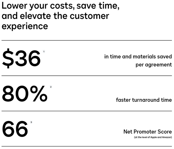 도큐사인은 자사가 제공하는 전자서명 서비스 덕분에 거래 당 36 달러를 감축할 수 있고, 83%의 전자서명 거래가 24시간 안에 끝나게 하며, 그중 50%는 15분 이내에 끝나 기존 종이 서명에 비해 80%의 시간을 절약한다고 밝혔다. 특히 NPS(Net Promoter Score)가 66에 달하는 것은 인상적이다. 100명 중 66명이 도큐사인을 남들에게 추천하고 싶다는 의견이므로 사용자 경험이 매우 만족스럽다는 것을 뜻하기 때문이다.