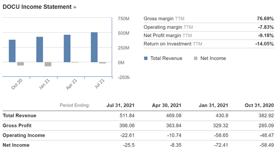 도큐사인은 기업 및 기관 고객 부분에서 이번 분기까지 53%의 CAGR(연평균 성장률)을 기록하였다. 2021년 기준, 3년 만에 약 3배에 달하는 성장세를 보여주고 있으며, 이에 더해 28.9%에 달하는 전자서명 시장의 성장률까지 더해져 이전에 없을 극적인 성장세를 기록하고 있다. 따라서, 우리는 2027년까지 79억 달러 규모로 성장할 것이 예상되는 전자서명 시장에서 앞으로도 도큐사인이 성장하기 위한 재무 안전성과 경쟁력을 가지고 있는지 자세히 살펴볼 필요가 있다.