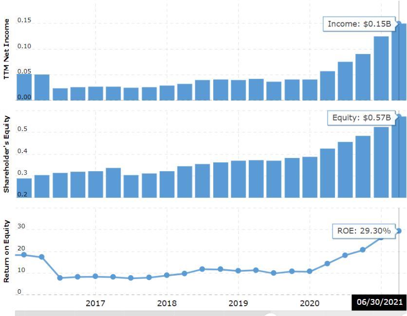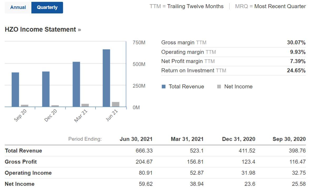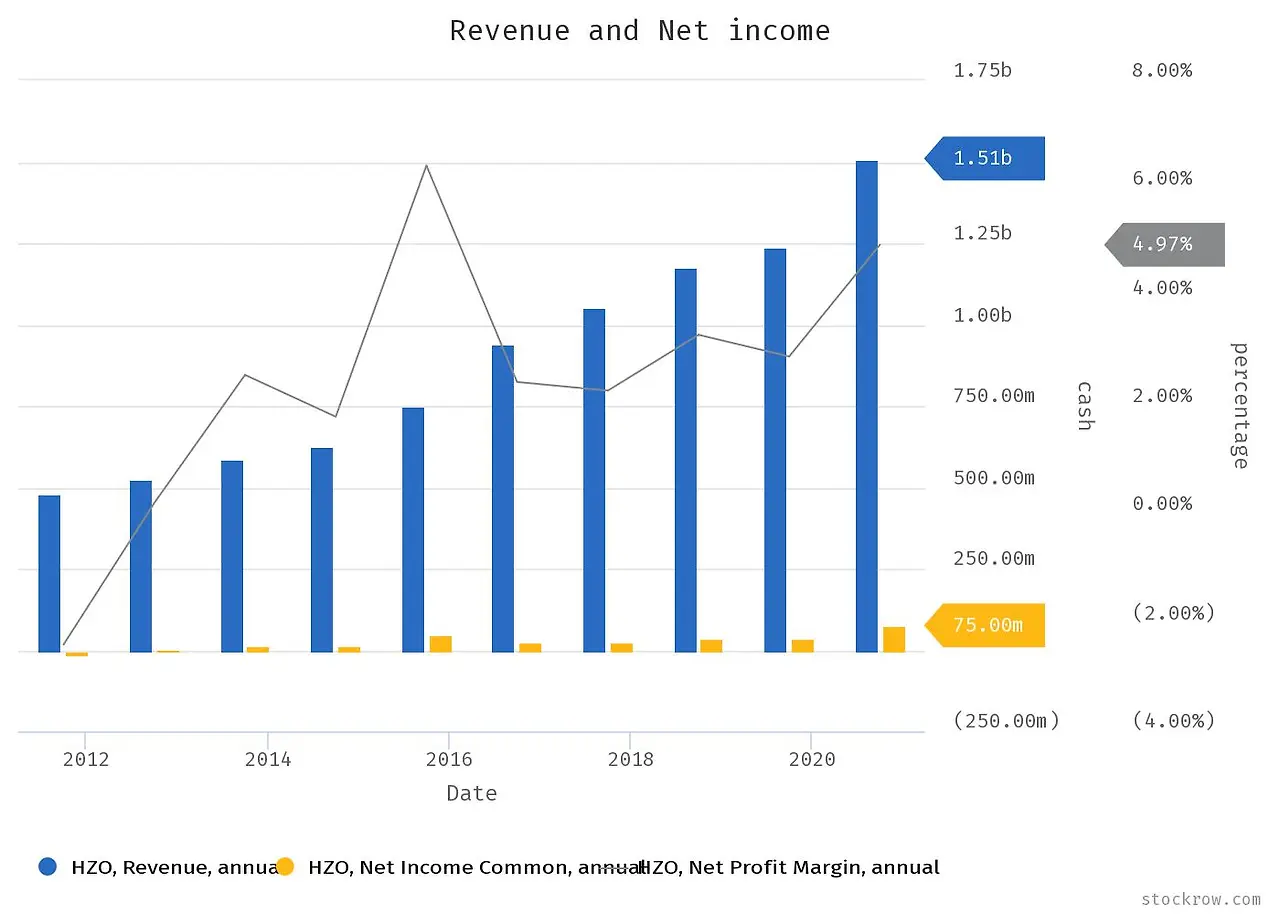마린맥스는 현재, 전 세계 100개가 넘는 지역에 진출해 있고 78개의 프랜차이즈 매장과 23개의 직영 매장을 운영하고 있다. 또한, 31개의 Marina(요트 선착장)에 8,000대가 넘는 요트를 소유해 고객들에게 대여 및 레저 서비스 제공하는 중이다. 마린맥스가 여기서 멈추지 않고 몸집을 키워나간다면 과거 실적에 비추어보았을 때, 수익성 역시 계속해서 개선될 전망이다. 특히 인수합병 시점과 맞물려 작년에 비해 두 배 이상 증가된 순이익은 주목할 만하다.