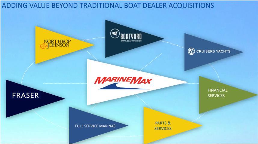 마린맥스가 지난 몇 년 동안 매출이 지속적으로 성장한 원인은 지속적인 인수합병의 공이 크다. 구체적으로 올해 5월의 경우, 6,300만 달러에 2020년 기준, 총매출이 7,500만 달러인 CRUISERS YACHTS를 인수했다. 이에 더해, 요트 유지 · 보수 서비스를 제공하는 디지털 플랫폼 기업인 Boatyard와 기존에 제공하는 민간 보험 서비스를 강화하는 금융 기업까지 인수하며 요트 산업 내에서 경쟁력을 강화하기 위해 노력하는 모습을 보였다. 결과적으로, 기존 요트 기업들에 대해서는 전방위적인 확장을, 다른 한편으로는 디지털 트랜스포메이션을 통한 UX(사용자 경험) 개선으로 매출 동인을 늘려가고 있다는 것을 알 수 있다.