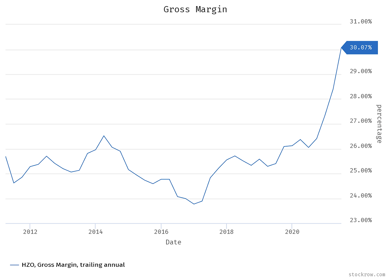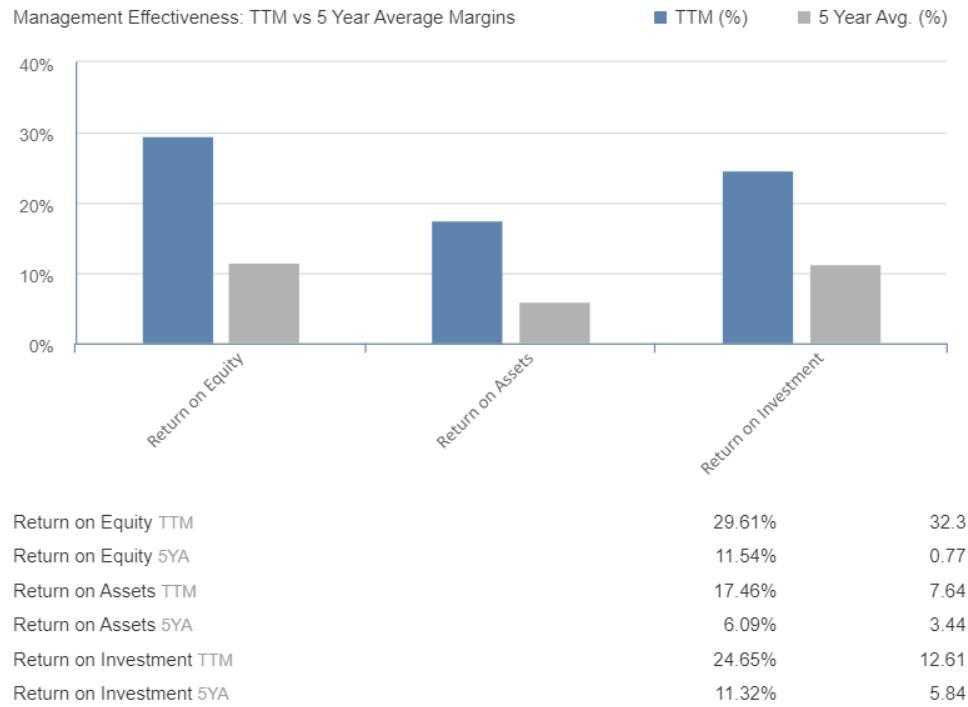 마린맥스는 최근 수익성 비율이 상당히 우수한 편이다. 구체적으로 살펴보면, Operating Margin(영업이익률), Gross Margin(매출 총이익) 그리고 Net Profit Margin(순이익률)이 각각 30.07%, 9.93%, 7.39%로 기준치인 40%, 10%, 8%에 근접해 이상적으로 여겨지는 수치에 상당히 가깝다. 이러한 성장세는 전 분기 대비 2배 이상 급증해 40%를 넘는 매출 증가세의 덕이 크며, 회사 자체적으로도 수익성 개선에도 박차를 가하고 있는 것으로 볼 수 있다.
