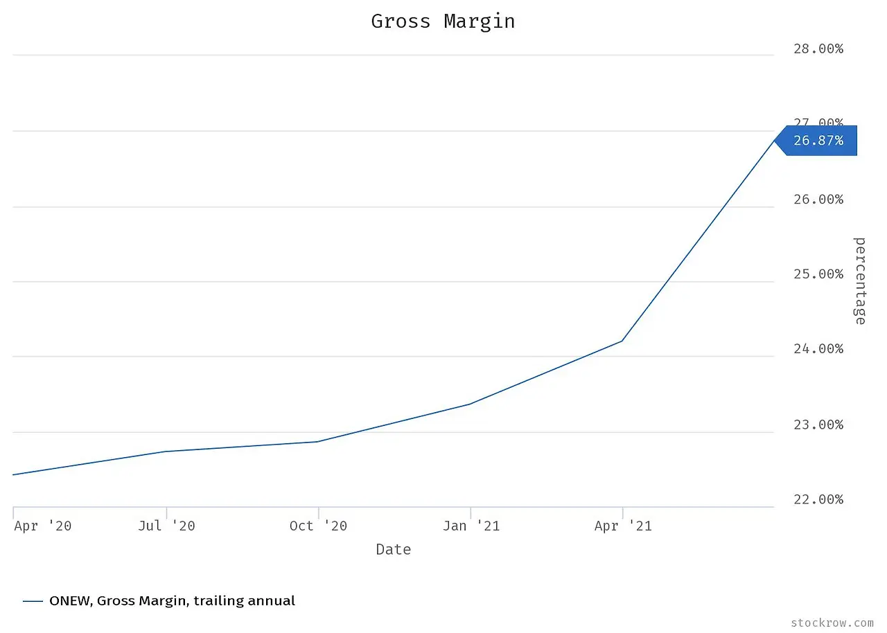 두 회사 모두 소비재(사치재)를 판매하는 기업인 만큼 시장에서 원가 우위가 큰 경쟁력을 가진다. 이에 따라 경쟁기업 대비 마진율을 체크해본 결과, Gross Margin(매출 총이익)이 각각 30.67%, 26.87%로 마린맥스가 우위에 서있는 것을 확인할 수 있다. 하지만 원워터의 경우에도 가파르게 성장세를 따라오고 있고 최근 3년 사이 마린맥스보다 두 배 많은 신규 매장을 개업하고 동시에 마린맥스와 같이 포트폴리오 다각화에도 열을 올리면서 경쟁이 심화되고 있는 상황이다. 이렇게 경쟁사가 추격해오고는 있지만 현재까지는 마린맥스가 미국 내부에만 치중된 원워터와 달리 전 세계에 수익원을 두고 있어 매출 안정성과 발전 가능성이 더 높은 것이 사실이다.