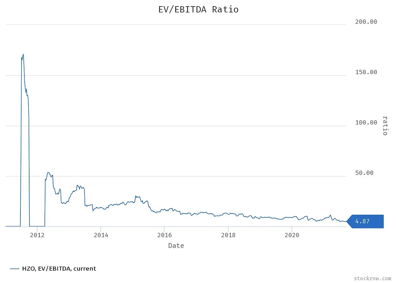 현재, 마린맥스의 P/E Ratio(주가 수익 비율)는 7.75로 산업 평균인 27.06에 비해 상대적으로 저평가되어있다. 또한 과거 실적 기반이라는 P/E Ratio의 단점을 보완하는 PEG Ratio(주가 수익 성장 비율) 역시 0.25로 기준치인 1에 비해 저평가되어 있어, 향후 성장 가능성이 상당히 높다. 게다가, 투자 시 원금 회수 기간을 나타내는 EV/EBITDA(기업가치/이자 · 세금 · 감가상각비 차감 전이익)도 꾸준히 낮은 경향을 보여주어 현재는 4.8년 안에 원금 회수가 가능할 정도로 회사의 이익이 증가했다는 것을 알 수 있다.