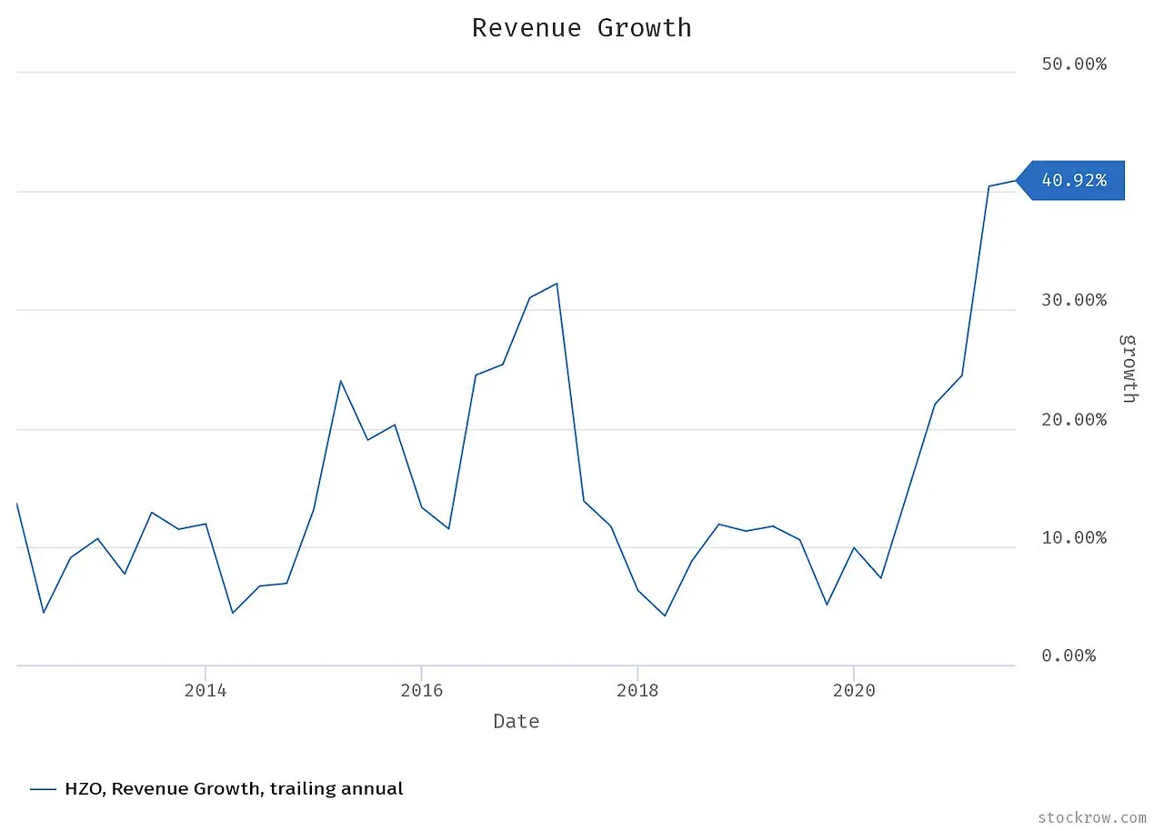 2021년 3분기, 44.1%로 전년 동기 대비 역대 최대 성장률을 보여준 마린맥스는 대표적인 미국의 요트 및 보트 도매기업이다. 프리미엄 브랜드 및 기존 도매 기업의 인수로 포트폴리오를 다각화하며 TTM(최근 12개월) 기준, 20억 달러 매출을 달성하고 순풍에 돛 단듯 성장하고 있는 중이다. 게다가 코로나19 시기, 요트가 사회적 거리두기에 적합한 여가활동이라는 장점이 부각되면서 미국 내 수요가 급증했고 신규 주문 후 6개월은 기다려야 요트를 수령할 수 있을 정도로 생산이 이를 따라가지 못하고 있는 실정이다.