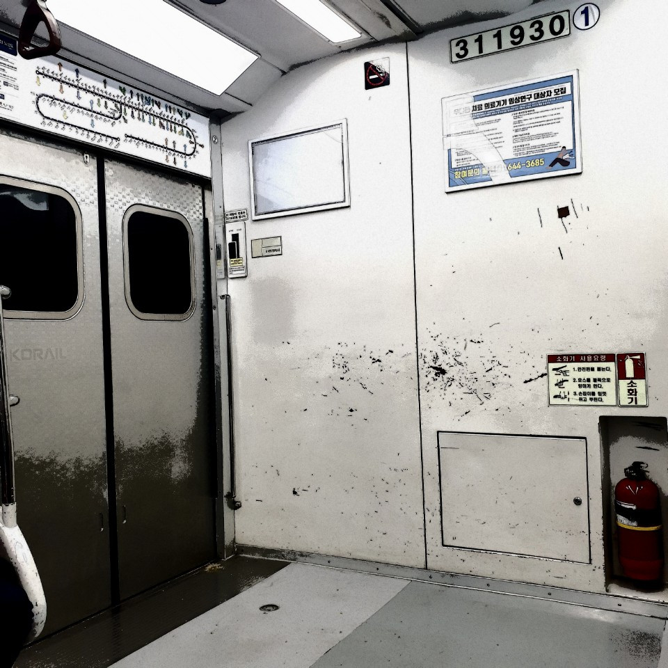 그렇게 정신없이 오랜만에 1호선을 탔지요. 무심결에 자리에 앉았는데 발밑 바닥에 핑크색이 어른거렸습니다. 이게 뭔가 싶어 봤는데 임산부 전용 자리라네요. 상식 없는 사람이 되고 싶지 않아 후다닥 일어나서 다른 곳으로 갔습니다. 곧 주위를 둘러보다가 칠이 벗겨진 벽을 발견했습니다. 그제야 제가 마지막 칸에 탔다는 것을 또한 깨달았습니다. 저도 언젠가 저 벽에 붙어 칠을 벗기는 것에 일조한 추억이 떠올랐지요.