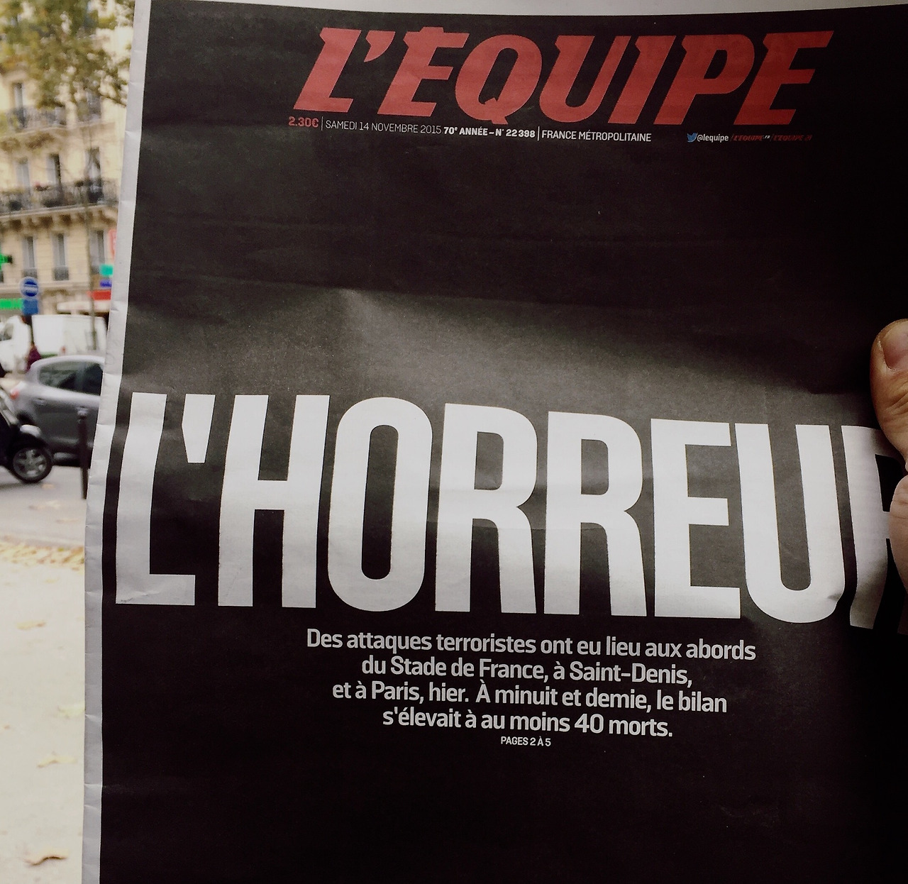 당시 숙소 TV가 안 나왔던 게 다행인지 불행인지 모를 일이다. TV는 물론이고 와이파이까지 작동이 안 되었기 때문에, 데이터가 많이 쓰이는 동영상은 볼 생각을 못했으며 테러에 관련된 소식은 실시간으로 올라오는 뉴스 기사를 통해 접했었다. 무슨 일이 벌어지는지 정확히 모르는 것도 두려운 일이지만, 아비규환이 된 현장의 영상을 생생하게 보는 것이 더 무서운 일이었을 것 같다. 그것도 사건 현장이 바로 한 시간 전까지만 해도 우리가 저녁식사를 하던 곳과 불과 얼마 떨어지지 않은 곳이었으니까 말이다. 자살폭탄이 터졌던 스타드 드 프랑스 국립경기장은 내가 당일 오전까지도 가자고 졸라댔던 곳이기도 했다. 하지만 경기 시간이 너무 늦고, 상대적으로 치안이 불안한 10구역에 위치했다는 이유로 포기했지만 말이다(내가 좋아하는 축구 선수인 폴 포그바와 독일의 마르코 로이스가 결장했다는 것 또한 중요한 요인이기도 했다).