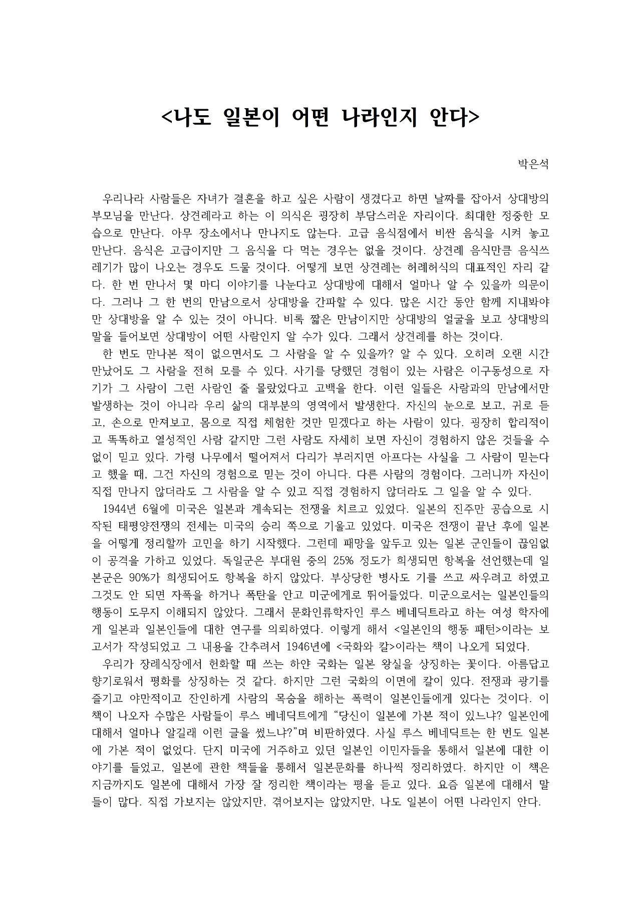단지 미국에 거주하고 있던 일본인들을 통해서 일본에 대한 이야기를 들었고, 일본에 관한 책들을 통해서 일본문화를 하나씩 정리한 것이다.