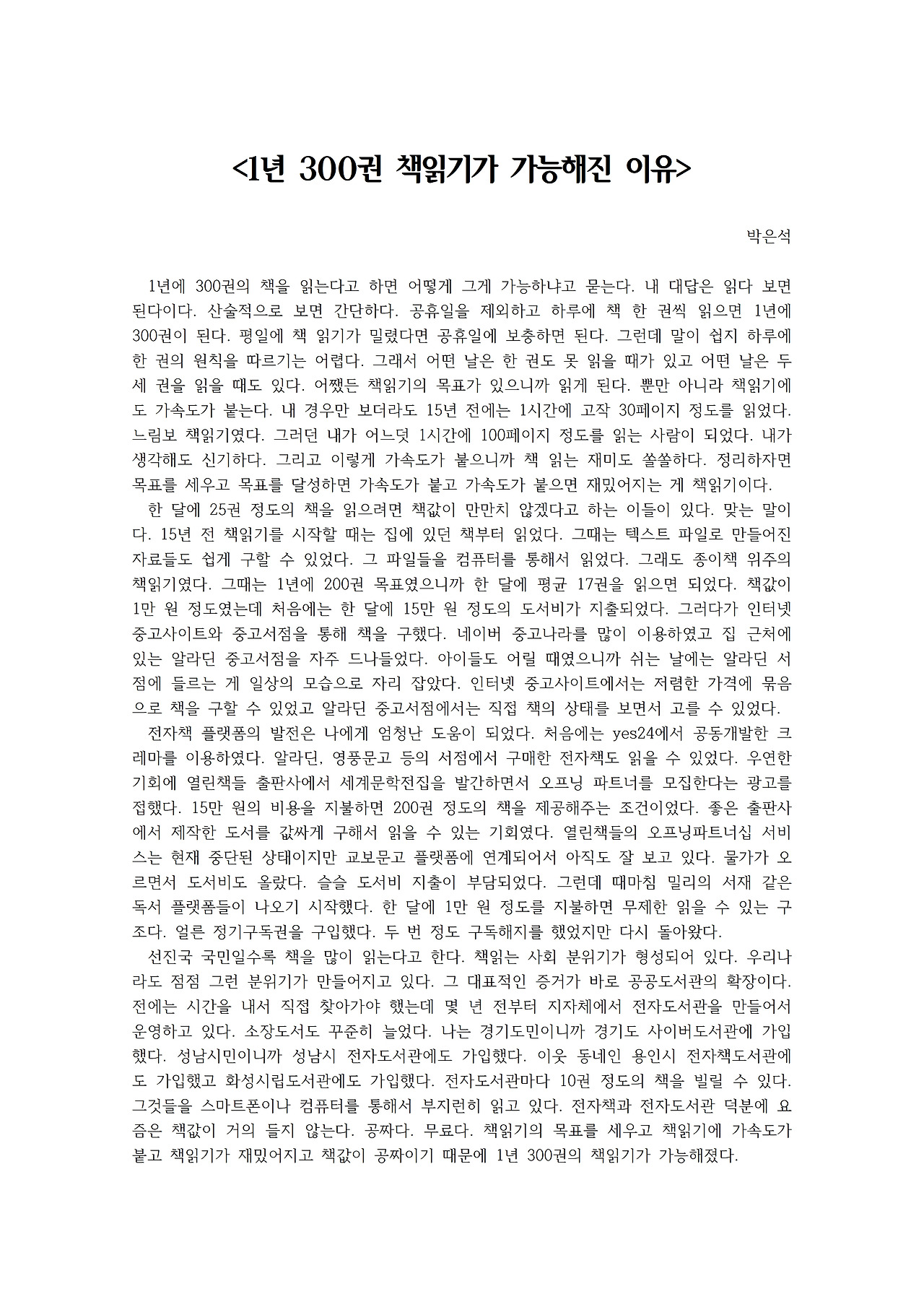 책읽기의 목표를 세우고 책읽기에 가속도가 붙고 책읽기가 재밌어지고 책값이 공짜이기 때문에 1년 300권의 책읽기가 가능해졌다.