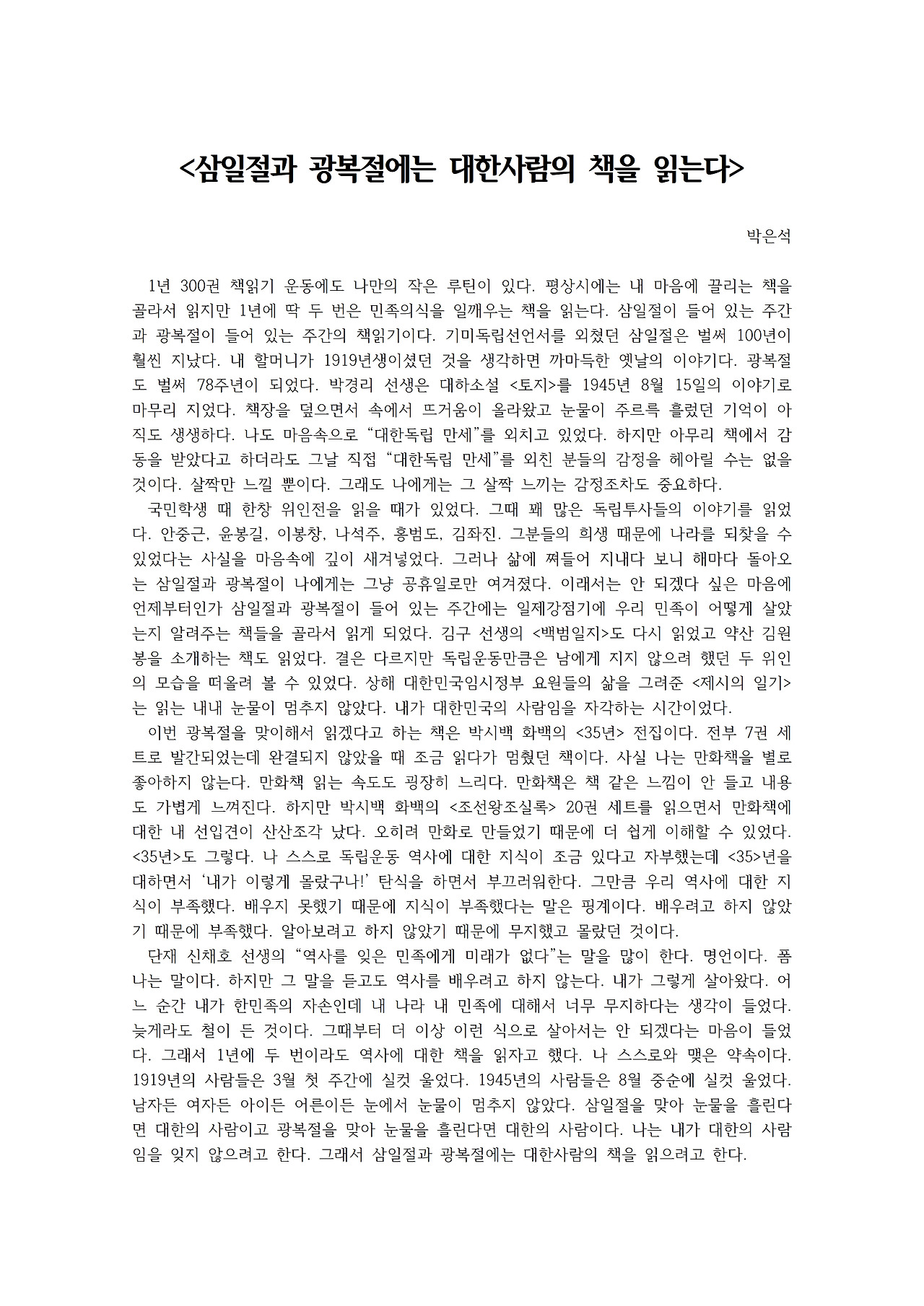 평상시에는 내 마음에 끌리는 책을 골라서 읽지만 1년에 딱 두 번은 민족의식을 일깨우는 책을 읽는다.