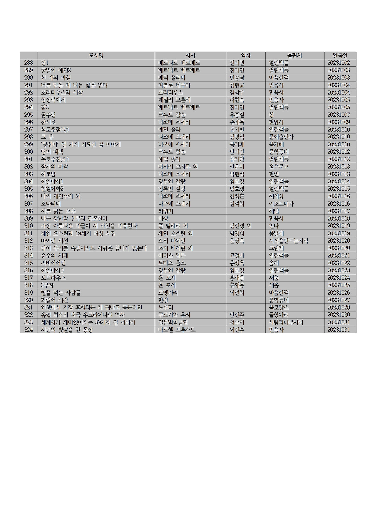 <1년 300권 책읽기 운동 2023년 10월 독서 목록>
