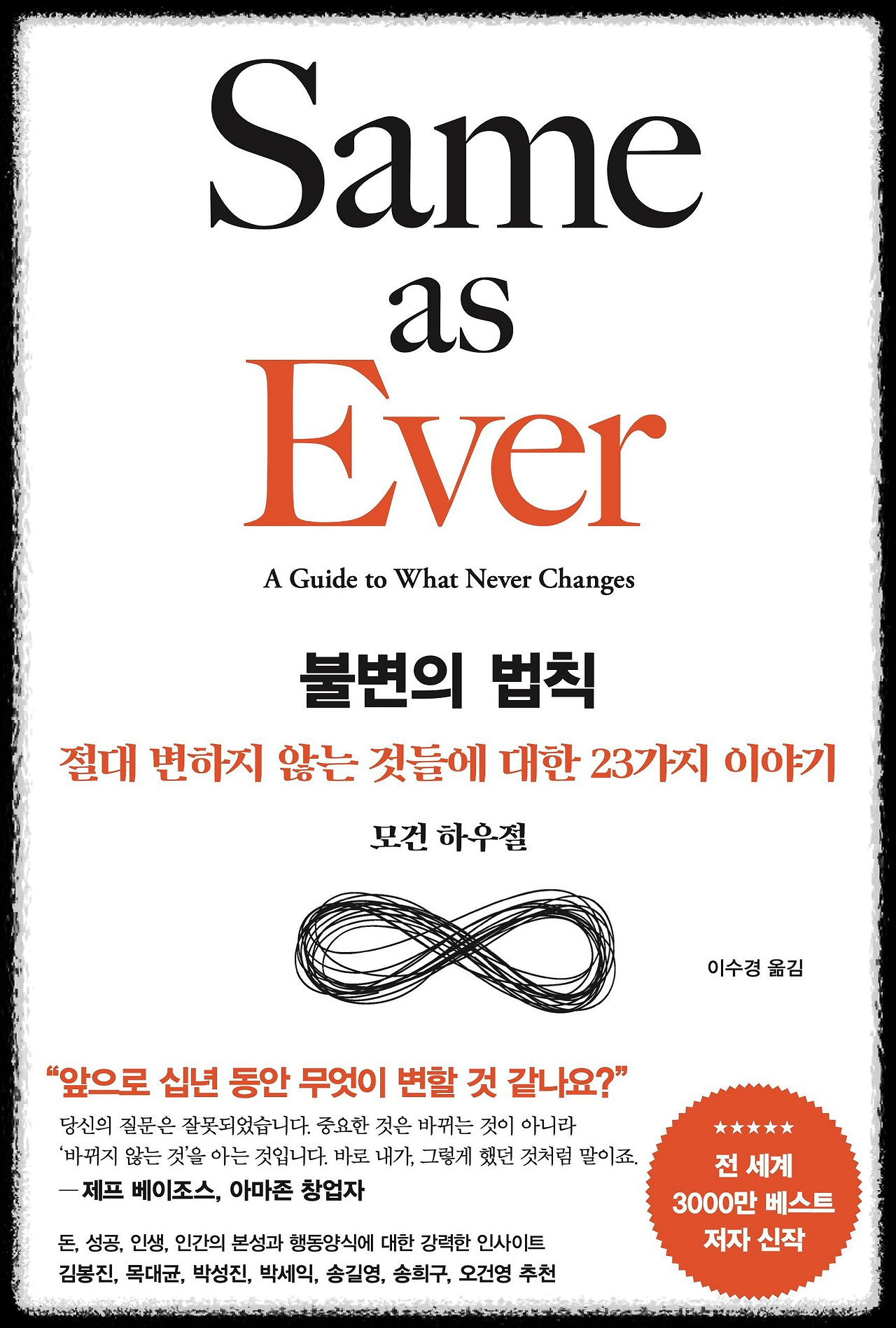 <돈의 심리학>이라는 책의 저자로 잘 알려진 모건 하우절(Morgan Housel)이 인간의 삶에서 변하지 않는 23가지의 법칙을 소개하는 책을 썼다. <불변의 법칙>이다. 세상은 변하지만 그 변화하는 세상 속에 살아가는 우리에게는 변하지 않는 것들이 있음을 알려주고 있다. 수천 년 전에 살았던 사람들이나 21세기를 살고 있는 우리나 비슷한 삶의 모습을 지니고 있다. 그때도 인생은 예측할 수 없었고 지금도 인생은 예측할 수 없다. 고대의 사람들은 사냥을 나갔다가 오히려 맹수에게 공격을 당할 수 있을 것이라는 불안감을 가지고 있었을 것이다. 최첨단의 시대를 살아가는 우리지만 오늘 집 밖에서 불의의 사고를 당하지 않을까 하는 노파심을 가지고 있다. 상황은 다르지만 옛날 사람이 했던 고민이나 지금 우리가 하는 고민이나 비슷하다. 아무 탈 없이 평안하면 마냥 좋고 뭔지 모를 불안감이 생기면 싫다. 불변의 법칙이다.