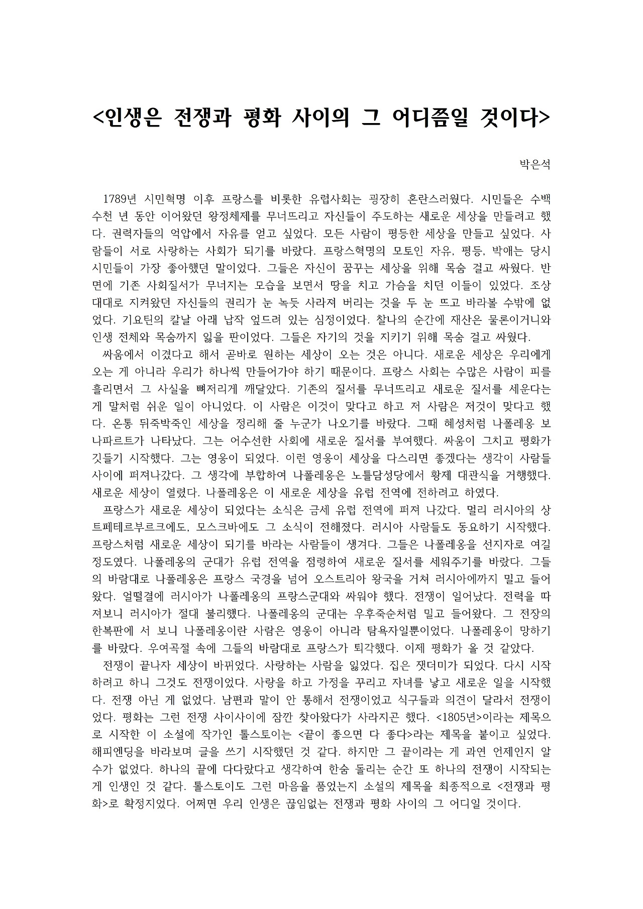 인생은 전쟁과 평화 사이의 그 어디쯤일 것이다