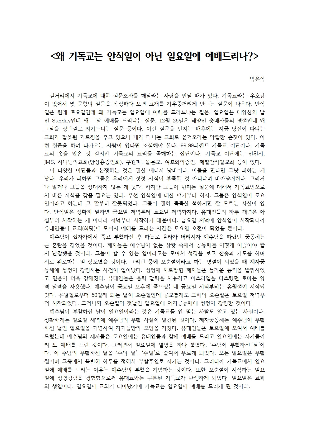일요일은 태양신의 날인 Sunday인데 왜 그날 예배를 드리냐는 질문.