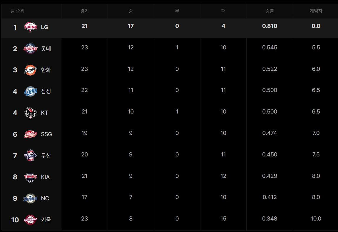 한 시즌 144경기를 치르는데 21경기를 치른 현 시점에서 17승 4패이다.