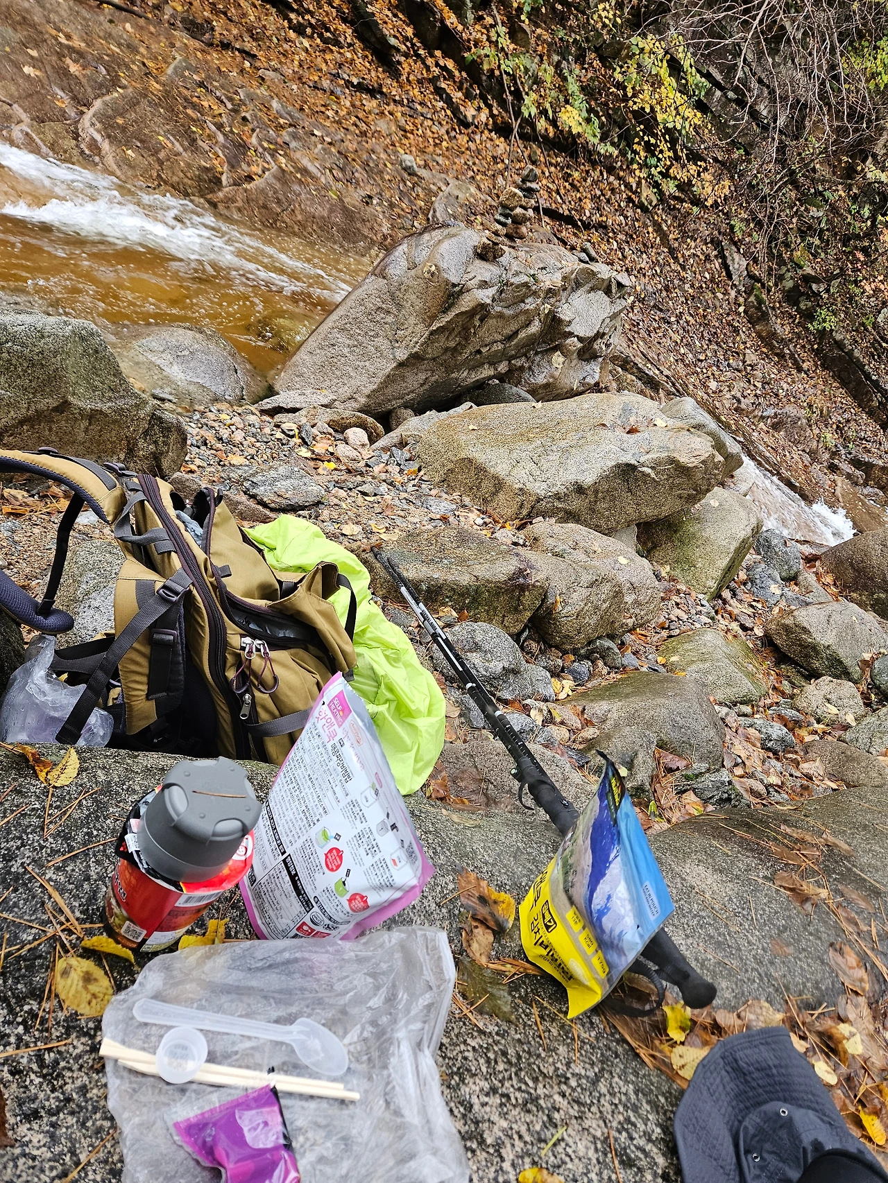 계곡물 옆에서 컵라면에 즉석밥을 먹었다.