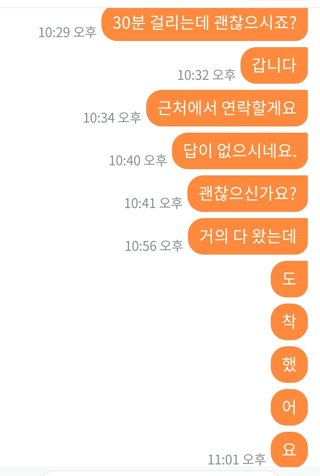 ‘갑니다’, ‘근처에서 연락할게요’ ‘답이 없으시네요’ ‘거의 다 왔는데’ 대답이 없었다.