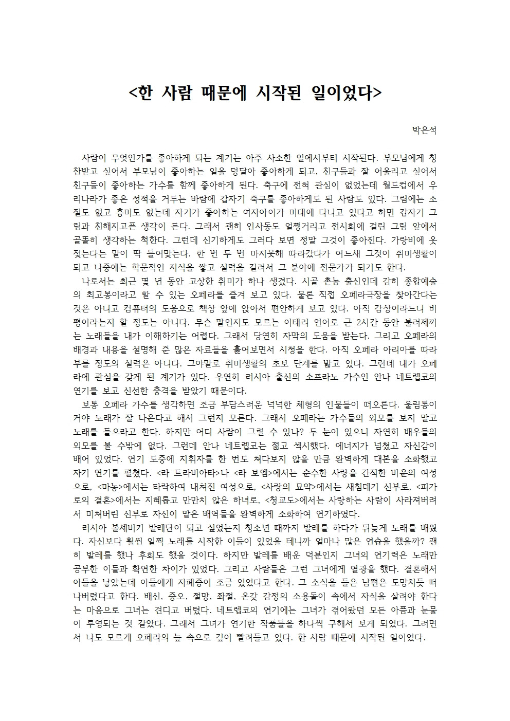 우연히 러시아 출신의 소프라노 가수인 안나 네트렙코의 연기를 보고 신선한 충격을 받았기 때문이다.