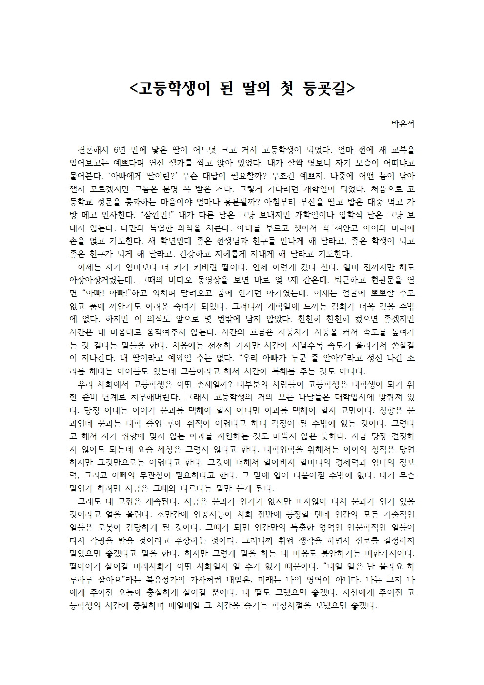 자신에게 주어진 고등학생의 시간에 충실하며 매일매일 그 시간을 즐기는 학창시절을 보냈으면 좋겠다.