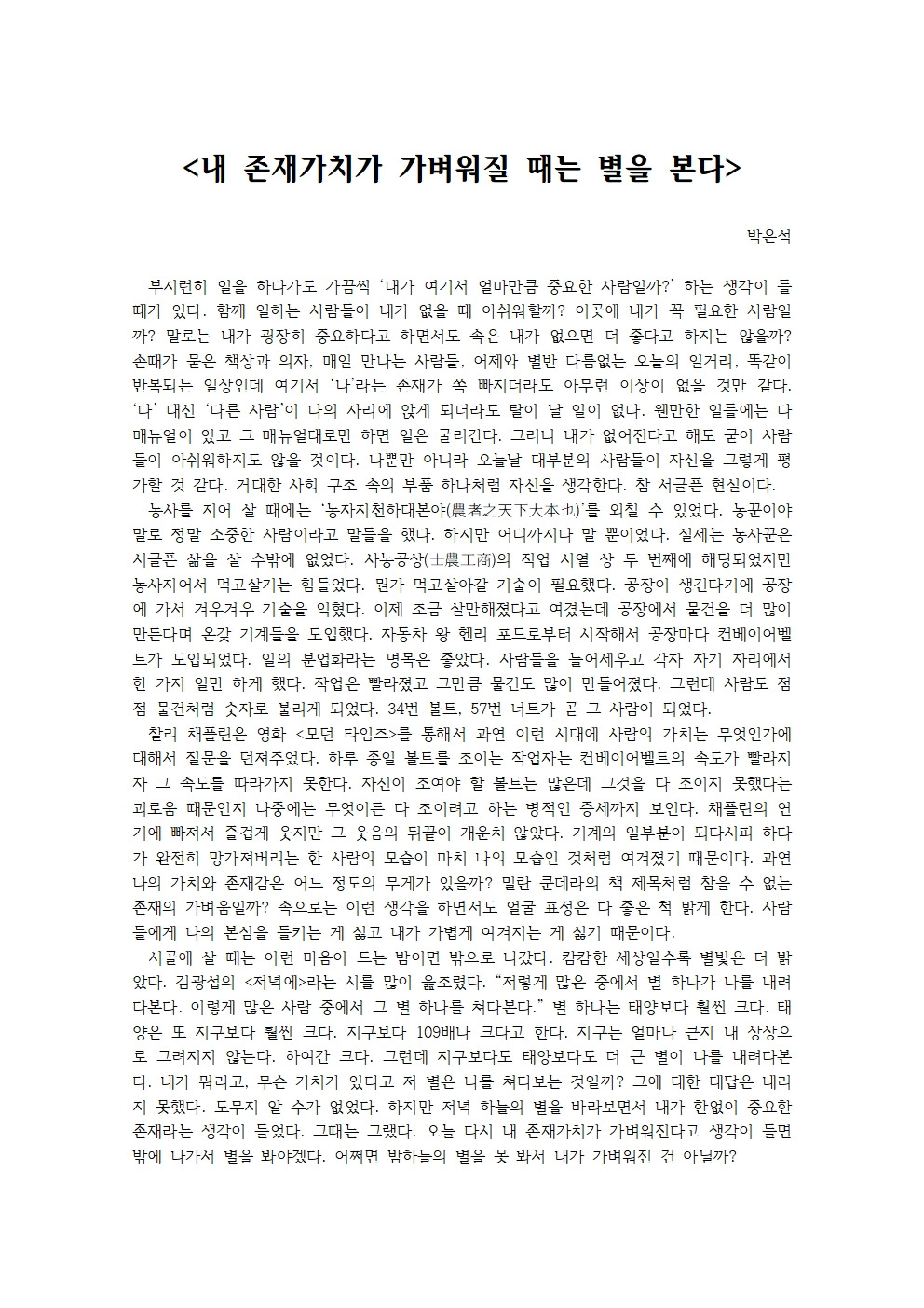 오늘 다시 내 존재가치가 가벼워진다고 생각이 들면 밖에 나가서 별을 봐야겠다.