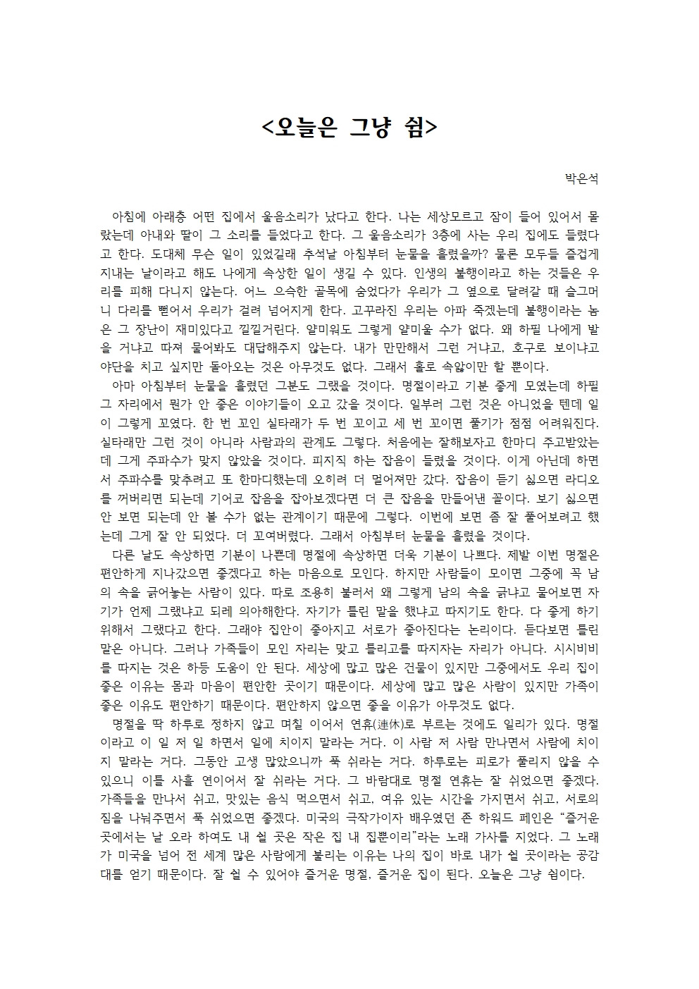 가족들을 만나서 쉬고, 맛있는 음식 먹으면서 쉬고, 여유 있는 시간을 가지면서 쉬고, 서로의 짐을 나눠주면서 푹 쉬었으면 좋겠다.