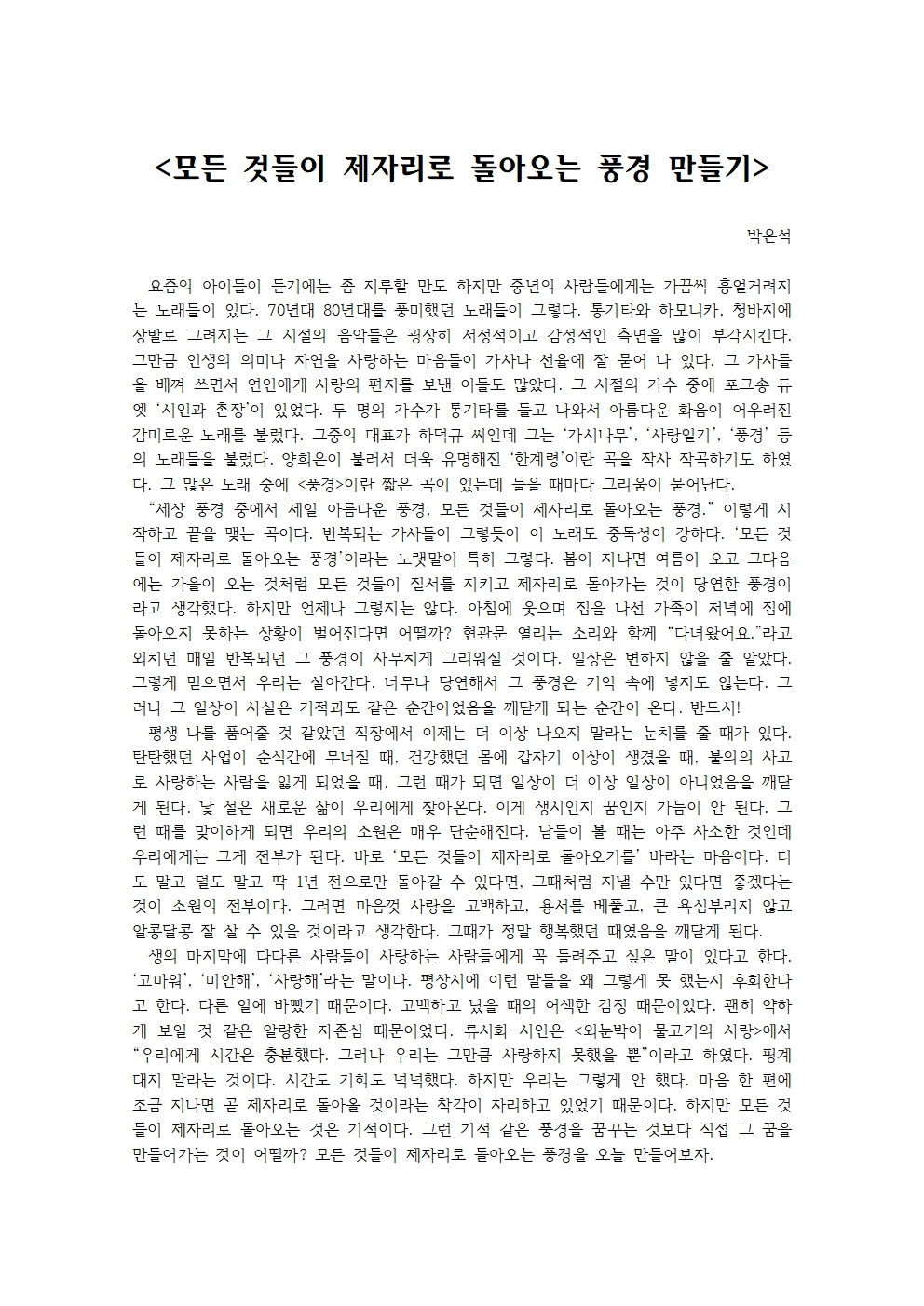 ‘모든 것들이 제자리로 돌아오는 풍경’이라는 노랫말이 특히 그렇다.